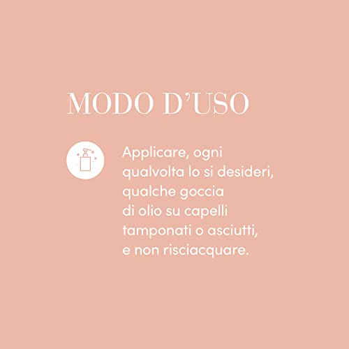 Modo d'uso: Applicare, ogni qualvolta lo si desideri, qualche goccia di olio su capelli tamponati o asciutti, e non risciacquare.
