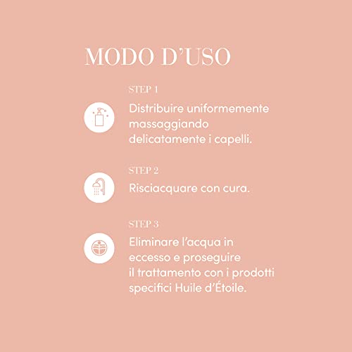 Modo d'uso: Distribuire uniformemente massaggiando delicatamente i capelli. Risciacquare con cura.