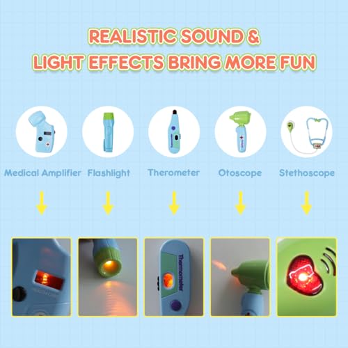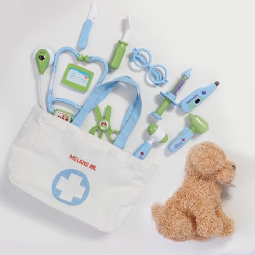 ♥ Peluche giocattolo per cuccioli e realistico set veterinario per bambini con effetto sonoro leggero Aggiungi divertimento extra: un sacco di accessori all'interno di questo set veterinario per bambini insieme a un morbido cane coccoloso. I bambini possono indossare il costume veterinario e utilizzare giocattoli veterinari per trattare l'animale domestico. Tutti gli articoli elettronici in questo set di veterinari da gioco vengono forniti con le batterie integrate e possono accendersi. Lo stetoscopio giocattolo può persino emettere un suono simulato del battito cardiaco. Il kit per veterinari funzionale, soddisferà meglio la curiosità dei bambini e manterrà l'immaginazione occupata per ore.