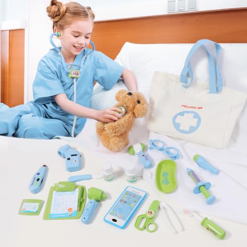 ♥ Set completo di medico per bambini con tutto ciò di cui il medico in erba ha bisogno: il set di 24 medici per bambini viene fornito con abbigliamento e cappello da medici per bambini, un giocattolo per cani da compagnia, una borsa tote e una gamma completa di kit medico per bambini tra cui stetoscopio giocattolo, otoscopio, termometro, torcia elettrica, monitor di impulsi, siringa, ecc. Numerosi giocattoli medici in questo set da gioco medico per bambini tra cui scegliere per mantenere i tuoi ragazzi e ragazze felici e divertiti mentre si vestono da medico junior o infermiera.