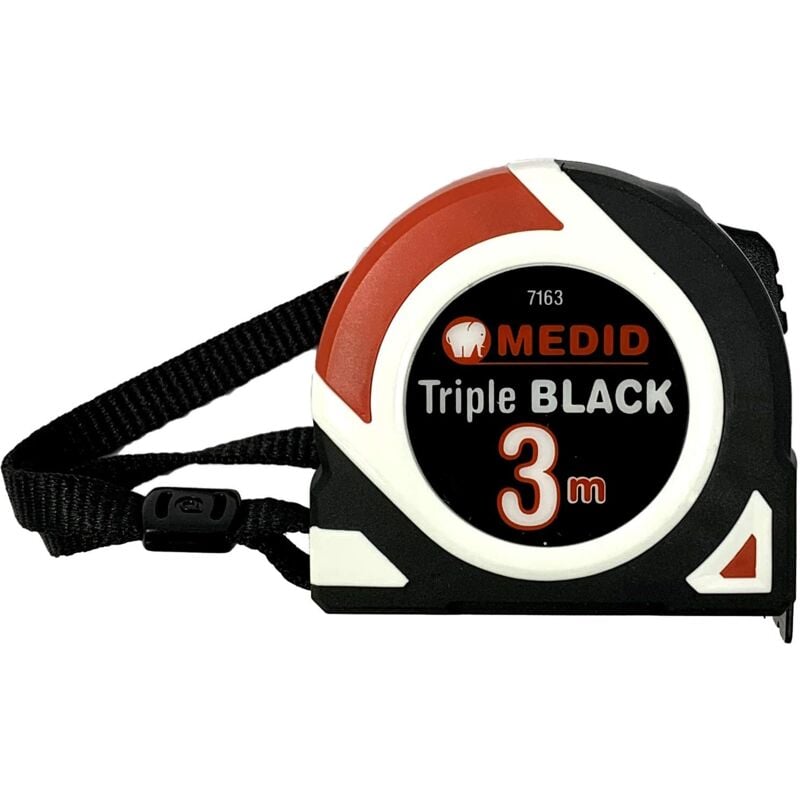 Flexometro Triplo Black 3 m x 16 mm. Nastro rivestito in nylon ad alta resistenza. Triple: astuccio tri-componente, con finitura soft. Astuccio rivestito in Elastollan antiscivolo. Nero: lato superiore del nastro su sfondo nero con numerazione in bianco, numerazione verticale sul retro nero su sfondo bianco. Alta visibilità: Flexometro dotato di freno, dotato di polsiera tessile e clip in vita.