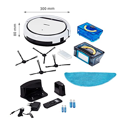 Contenuto della confezione: Robot aspirapolvere MEDION con funzione di pulizia, telecomando (con 2 batterie AAA incluse), stazione di ricarica, 2 filtri, 2 spazzole laterali, 2 spazzole laterali di ricambio, spazzola per la pulizia, serbatoio dell'acqua, supporto, 2 panni per la pulizia, parete virtuale (incluse 2 batterie AA).