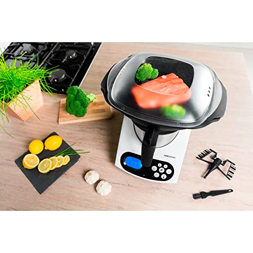 Contenuto della confezione:Medion, robot da cucina con funzione di cottura (MD 16361), frullatore, vaporiera, spatola, misurino, spazzola per la pulizia, ricettario.