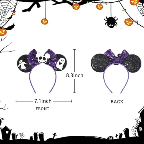 【Bellissimo Design】 Include 4 diversi modelli a tema Halloween. Fantasma, zucca, pipistrello, ragno, mistero e bella apparenza vi aiuterà ad attirare l'attenzione degli altri. Ti porta una meravigliosa atmosfera di Halloween. Anche i nostri cerchietti con orecchie di topo con paillettes brillanti su entrambi i lati, questo cerchio per capelli è stato decorato con orecchie rotonde di topo e un fiocco carino. Sembra così bello ed è popolare tra adulti e bambini.