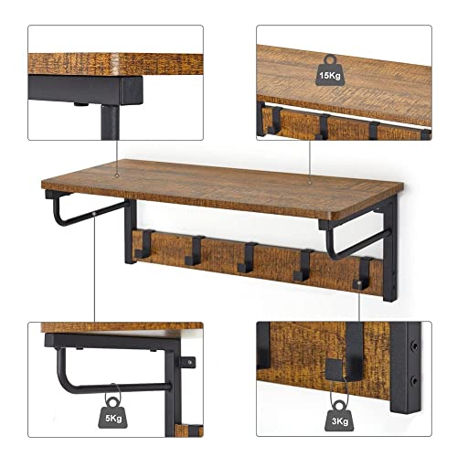 Meerveil Appendiabiti da Parete con 5 Ganci, Mensola con 2 Barre Industriale per Ingresso Soggiorno Bagno Camera da Letto, 67 x 28 x 24 cm, Marrone Vintage e Nero