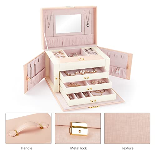 Meerveil Scatola Portagioie, 26 x 19 x 18 cm, Cofanetto Portagioielli con 3 Cassetti Serratura e Specchio, da Viaggio, per Ragazze e Signore, Anelli Braccialetti Orecchini Collane, Rosa