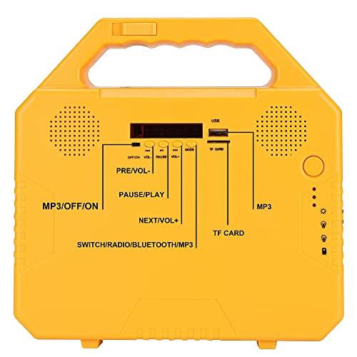 Multifunzione in un unico design dettagli tecnici: Display LED digitale. Torce integrate e lettore MP3, supporto USB e scheda TF. Radio FM integrata. Uscita a 2 porte per luce a LED (le nostre lampadine con interruttore individuale e cavo da 3 m). 2 uscite USB 5 V CC per tablet, telefono, ventole USB, fotocamera digitale... Più durevole da usare, buona stabilità, per aiutarti in caso di emergenza .