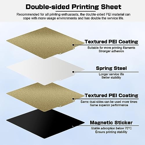 Provate la piattaforma di stampa PEI su due lati! Avrete a disposizione un unico foglio di PEI a doppia texture con un'adattabilità e un'adesione ottimali. Il foglio di acciaio elastico assicura una facile rimozione e una lunga durata, completando perfettamente l'adesivo magnetico flessibile per mantenere le stampe stabili durante il processo di stampa.