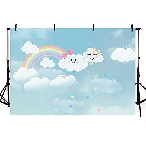 MEHOFOTO - Sfondo fotografico carino con motivo a fumetto arcobaleno blu cielo nuvola bianca, decorazione per feste di compleanno per la fotografia, 2,1 m x 1,5 m