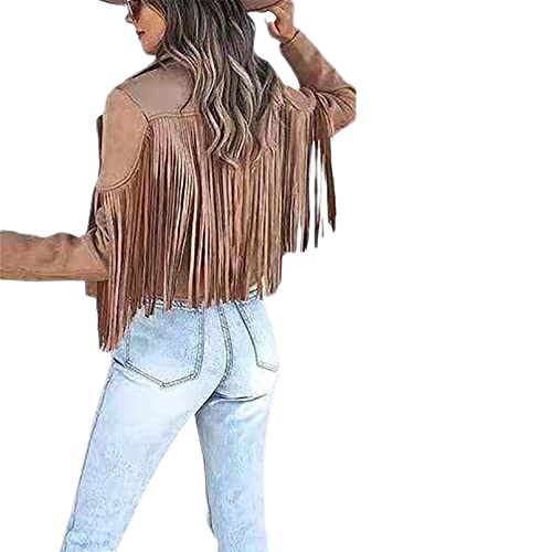 Meicywybb - Giacca da donna in finta pelle scamosciata, con nappa, a maniche lunghe, con risvolto e frange, hippie, per motociclista, Caff, M