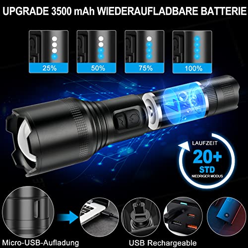 【Torcia ricaricabile e indicatore di potenza】: la torcia a LED ha una durata di oltre 100.000 ore. Batteria ricaricabile agli ioni di litio da 3500 mAh (inclusa) con circuito di controllo digitale interno per evitare il sovraccarico e garantire la sicurezza. È completamente carica in sole 4 ore supporta un utilizzo di 12 ore in modalità Low Light.