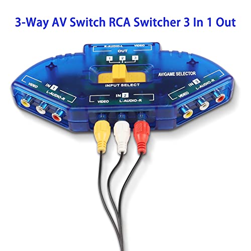 MEIRIYFA 3-Way AV Switch RCA 3 in 1 out, RCA Audio Video AV Selector Box con cavo RCA per VCD, DVD, registratore (Blu)
