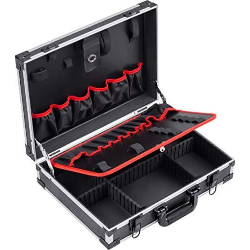 La custodia utensile master vuota è ideale per la memorizzazione di strumenti, assortimenti o piccole parti. Dividere i vassoi individualmente in base alle tue esigenze: le cinque partizioni sono rimovibili e possono essere utilizzate in qualsiasi posizione. Il rivestimento della schiuma garantisce sempre la necessaria protezione dei tuoi utensili. Negli inserti da 15 tasche per utensili, gli strumenti utilizzati aggiuntivi possono essere riposti chiaramente e pronti a maneggiare. Inoltre, i velcro e le nabbre in gomma forniscono una presa stabile, ad esempio per scatole di piccole parti o set di bit. Grazie al pratico inserto intermedio, ampi resort utensili possono anche essere sistemati compatti. Se sono necessari fluidi di lavoro dalla parte inferiore della valigia, l'inserto può essere fissato sul lato tramite le staffe stabili. Angoli antiurto e forti chiusure di serraggio della valigia in alluminio di alta qualità garantiscono una stoccaggio sicuro. Con l'aiuto della comoda