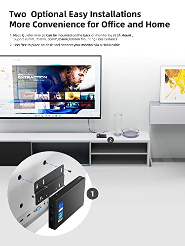 Design tascabile, portatile e senza ventole --MeLE Quieter3 è un piccolo fattore di forma di dimensioni 0,7 pollici x 3,2 pollici x 5,2 pollici/ 18,5 mm x 81 mm x 131 mm, può essere riposto in una tasca e facile da trasportare per un viaggio di lavoro. Il design salvaspazio con una staffa VESA montata sul retro di una TV o di un monitor, migliora notevolmente l'ordine dello spazio della scrivania dell'ufficio. Il design senza ventola di 0dB di rumore offre un'esperienza silenziosa e confortevole quando si lavora con questo PC silenzioso.