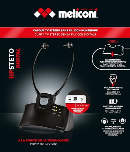 Meliconi HP Steto Digital, Cuffia Wireless Stereo con Base di Ricarica, Cuffie TV Stetoscopiche con Microfono, Durata 8 Ore, Collegamento Analogico 3.5mm e Digitale, Auto-Tuning, Portata 20m, Nero