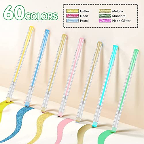 VARIETÀ DI COLORI: questo set di penne glitterate colorate include 60 penne colorate gel e 60 ricariche per penne gel. Le penne colorate includono 4 stili di inchiostro: (metallico, neon, gesso ad acqua, penne glitterate). I colori sono belli e audaci per produrre un pezzo spettacolare di opere d'arte.