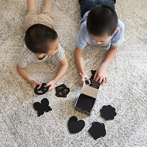 Gratta messaggi, scarabocchi, schizzi, disegni, motivi e altro ancora sui bigliettini sagomati Scratch Art per rivelare vortici di colori e realizzare messaggi, opere d'arte, biglietti e tante altre creazioni uniche