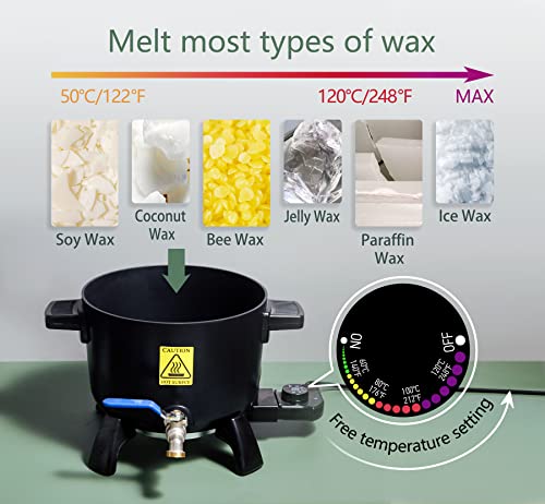Riscaldamento rapido e uniforme: il forno di fusione della cera ad alta efficienza ha una velocità di riscaldamento molto elevata. Sotto l'impostazione di 110 °C, 2 kg di cera di soia possono essere sciolti in 6 minuti. velocizzerà la produzione di candele in modo da poter effettuare facilmente ordini all'ingrosso.