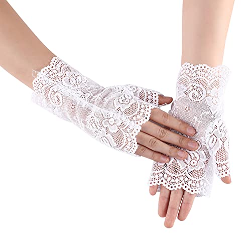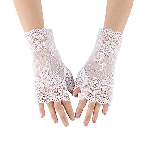 Memoryee Guanti senza dita corti in pizzo per donna Guanti da ballo da sposa con motivo floreale al polso per accessori per costumi da festa di nozze Bianco