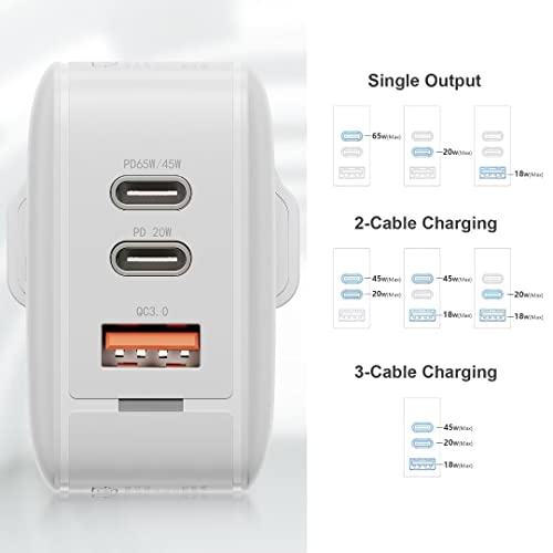 [3 in 1 Progettare]: Con 2 * USB-C (uscita porta singola 20 W-65 W max) e 1 * USB-A (18 W) multi-porta e protocollo PD3.0 QC3.0+, questo caricabatterie rapido USB è in il In grado di caricare tutti i dispositivi iOS e Android. E le sue dimensioni ridotte sono adatte per lavorare da casa.