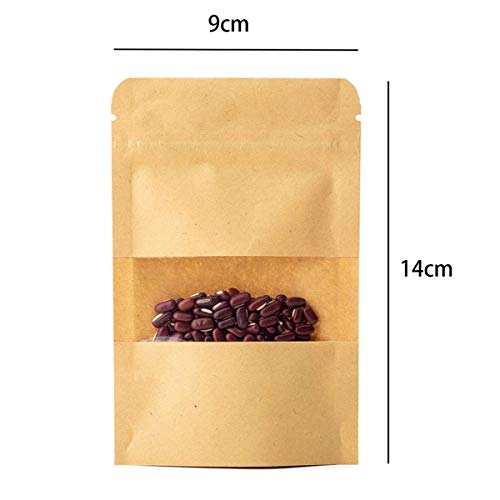 Mengger 100Pcs Sacchetto di Carta Kraft Autosigillante Marrone Stand Up con Finestra Trasparente Zipper con Chiusura Sacchetti Usato per Conservare Il Cibo Pane Chicchi di caffè Noccioline Snack Borse