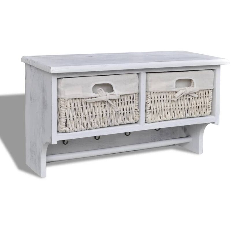 Questa mensola a muro, realizzata in legno di alta qualità, presenta un design semplice ma elegante. Sarà non solo un posto di stoccaggio per le vostre cose, ma migliorerà anche il vostro arredamento. Questa fantastica mensola a muro offre spazio di stoccaggio e spazio per appendere. È dotata di due cestelli di tessitura, che sono entrambi solidi. Quattro ganci metallici vi offrono più spazio per appendere cose come chiavi, cappelli o guanti, e una traversa la rende perfetta per mettere asciugamani e altri tessuti. Assicuratevi che il ripiano è montato ad un'altezza adeguata. Colore: Bianco Dimensioni: 60 x 23,5 x 33 cm (L x P x A) Telaio robusto in legno di paulownia La consegna include 1 mensola a muro, 2 cesti e 4 ganci Materiale: Cotone: 20%, Poliestere: 80%