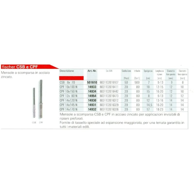 Mensole tasselli a scomparsa Fischer CPF CSB Per l'applicazione invisibile di ripiani su parete di materiale semicompatto e compatto Mod. CPF 10x100N