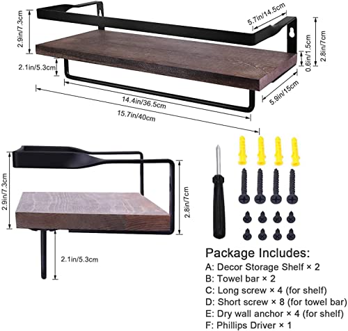 Set di 2 Mensole Galleggianti da Parete, Mensole da Muro in Legno con Barra Porta Asciugamani per Camera da Letto, Bagno, Cucina, 40 x 15 x 1,5cm, Rustica (Nero Carbonizzato)