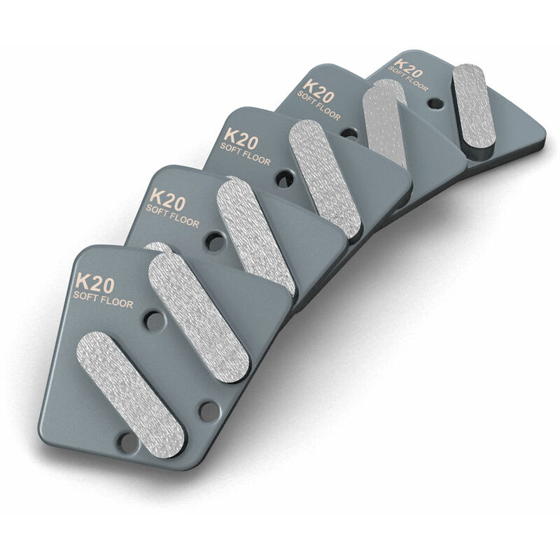 Segmenti diamantati (soft) per MENZER ESM 406 Informazioni sul Prodotto Velocemente montabile sul platorello diamantato MENZER Realizzato con segmenti di diamante di alta qualità Per la lavorazione versatile delle superfici I segmenti diamantati MENZER G20 soft floor vengono utilizzati insieme al platorello diamantato MENZER ESM 406. Sono particolarmente adatti per levigare il calcestruzzo morbido, la bauxite, la malta di solfato di calcio, la carta feltrata e l'asfalto (bitume, PEN max. 100). Inoltre, possono essere utilizzati per rimuovere residui di schiuma, giuta o vernice dal tappeto e per lavorare il calcestruzzo duro, la malta di cemento, la colla per piastrelle e gli adesivi (< 1 mm). In un set ci sono 5 segmenti diamantati.
