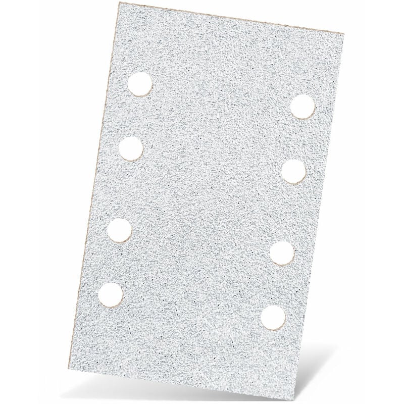 Carte abrasive velcrate MENZER, G100 Informazioni sul Prodotto Elevate prestazioni di asportazione Elevata qualità della superficie Riduzione dell'intasamento del disco abrasivo Dati tecnici Supporto: Carta UltraFlex Dimensioni: 133 x 80 mm Tipo di abrasivo: Fogli abrasivi Attacco: Sistema a strappo Grana classificazione: Media Foratura: 8 fori Tipo di grana: Corindone normale Applicazione Legno: 7/10 Gesso, stucco: 8/10 Colore, vernice: 8/10 Legenda: 10 - molto adatto, 0 - non adatto Descrizione del Prodotto MENZER White - Il prodotto classico per le finiture interne. Eccezionale su colori, vernici e stucchi MENZER White è lo specialista comprovato per le finiture interne ed è perfetto per la lavorazione di gesso e stucchi ma anche di colori e vernici. Lo speciale rivestimento CoolTec di MENZER impedisce in modo efficace che l'abrasivo possa intasarsi prematuramente. Pertanto, White MENZER ha una lunga durata su superfici termoplastiche come materiali plastici e vernici. White MENZER