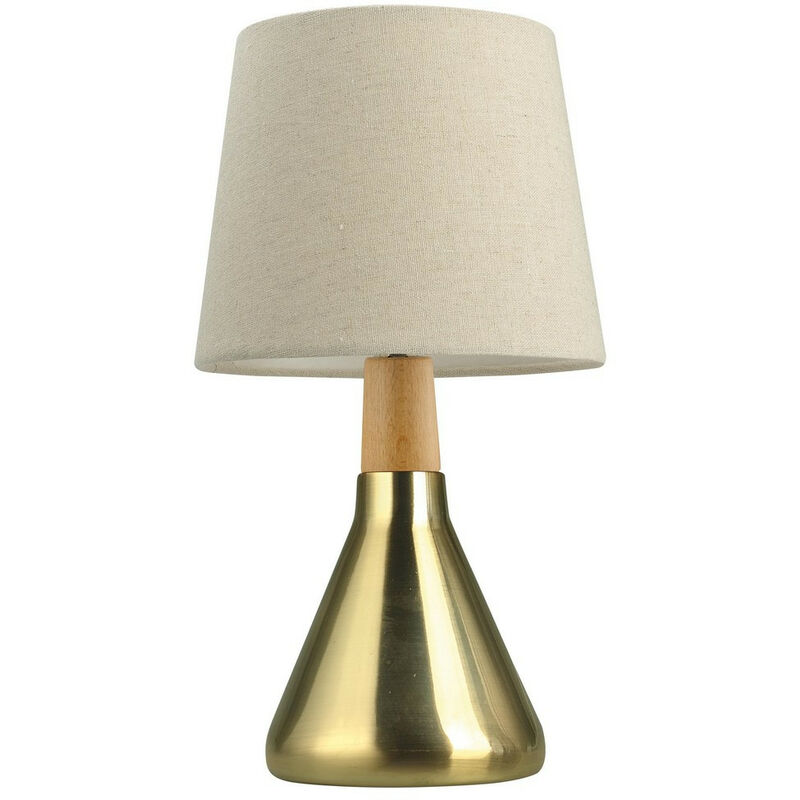 Merano Alberta Lampada da tavolo con paralume tondo affusolato in metallo ottone, legno naturale paralume in tessuto bianco sabbia LED E14 | Finitura: ottone, sabbia | Materiale: metallo, legno, tessuto | Classificazione IP: IP20 | Altezza: 33,5 cm | Lunghezza: 20 cm | Tipo di lampada: E14 | N. di lampade: 1 | Lampadina inclusa: No | Dimmerabile: No | Potenza (massima): 1x12W