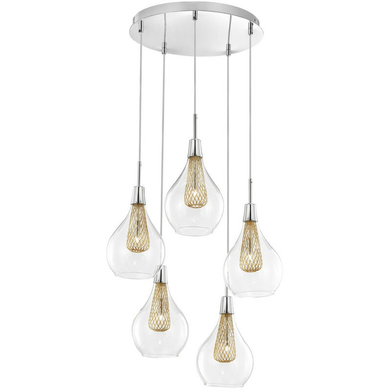 Merano Esquimalt Lampada da soffitto a sospensione a 5 luci, alluminio cromato, vetro trasparente, cornice dorata LED G9 | Finitura: trasparente, oro | Materiale: alluminio, vetro | Classificazione IP: IP20 | Altezza: 120 cm | Lunghezza: 37 cm | Larghezza: cm | Tipo di lampada: G9 | N. di lampade: 5 | Lampadina inclusa: No | Dimmerabile: No | Peso: 3,4 kg | Potenza (massima): 5X5W