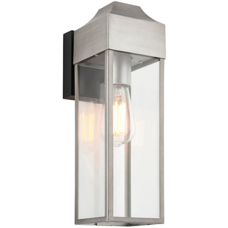 Merano Potenza Lanterna da parete per esterno Argento spazzolato, Nero opaco, Vetro trasparente | Finitura: finitura argento spazzolato, nero opaco, vetro trasparente | Materiale: lega di alluminio pressofuso, acciaio, vetro | Grado di protezione IP: IP44 | Altezza: 38,2 cm | Larghezza: 12 cm | Proiezione: 15,7 cm | Tipo di lampada: E27 | N. di lampade: 1 | Lampadina inclusa: no | Dimmerabile: dimmerabile | Peso: 1,95 kg | Potenza (massima): 10 W