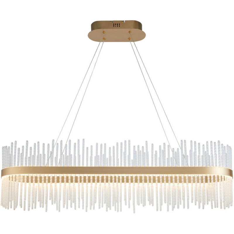 Merano Trapani Plafoniera a sospensione a barra placcata oro spazzolato, vetro trasparente | Finitura: finitura placcata oro spazzolato, vetro trasparente | Materiale: acciaio, lega di alluminio, vetro | Grado di protezione IP: IP20 | Altezza minima: 35 cm | Altezza massima: 165 cm | Lunghezza: 95 cm | Larghezza: 25 cm | Tipo di lampada: LED integrato | N. di lampade: 1 | Lampadina inclusa: sì | Dimmerabile: dimmerabile | Kelvin: 3000K bianco caldo | Lumen: 5961lm | Peso: 3,5 kg | Potenza (massima): 47 W