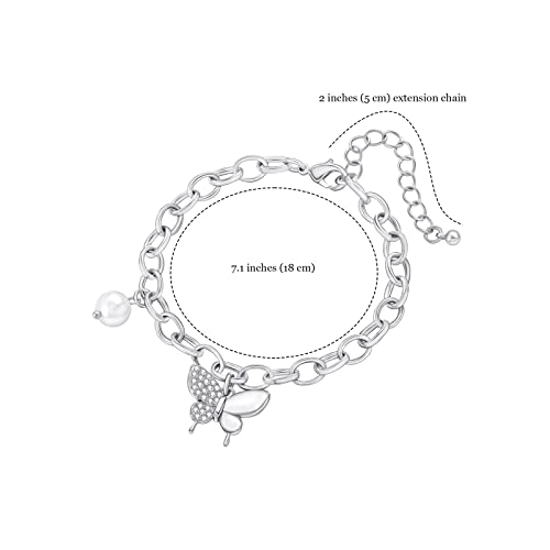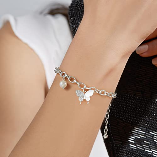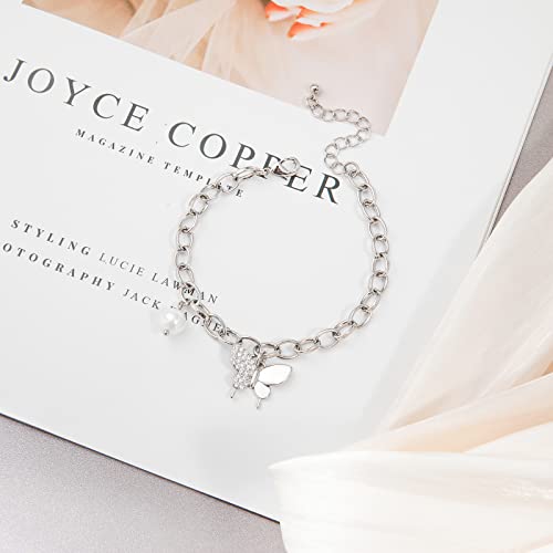 Mesovor Bracciali Farfalla per Donne Ragazza, Catena via Cavo Placcata in Oro 16K con Braccialetto Regolabile Perla | Braccialetto Scintillante Zircone (argento)