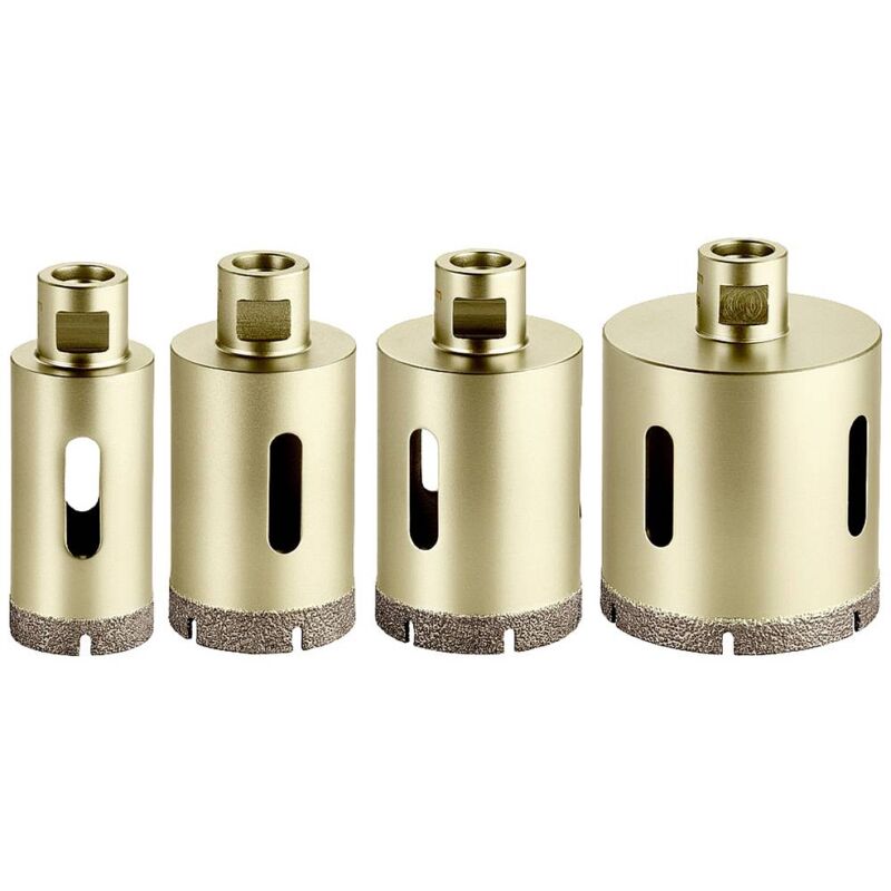 Dettagli tecnici Tipo prodotto Fresa diamantata a umido Kit di corone diamantate Dry, 4 pz. M14 Kit composto da: 1 x Ø 35 mm, 40 mm, 50 mm, 68 mm filettatura 14 per l'uso su smerigliatrice angolare Lunga durata e rapido avanzamento della foratura grazie alla saldatura a diamante a vuoto. Rimozione semplice del nucleo di foratura grazie alle cavità laterali Non è necessario alcun raffreddamento aggiuntivo. Ø 6-14 mm hanno anche un'emulsione di cera integrata per un migliore raffreddamento. In caso di fori successivi si consiglia di raffreddare brevemente la corona con acqua dopo ogni foro. Come lunghezza utile si consiglia la resistenza della lastra/pietra fine/lastra di granito. Generalmente max. 2 cm. I piani di lavoro/ripiani in granito possono essere forati fino a 5 cm. In questo caso, la corona deve essere estratta più volte dal foro per raffreddarsi brevemente!importante: In caso di materiale posato non perforare nel terreno!velocità massima di esercizio: 80 m/s. Testo tradotto