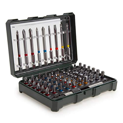 · Composto da: Bit S 2 · L= 25 mm (60 pz.): PH 1 x 3, PH 2 x 6, PH 3 x 3, PZ 1 x 3, PZ 2 x 6, PZ 3 x 3, SL 4 x 3, SL 6 x 3, H 4 x 3, H 5 x 3, H 6 x 3, T 10 x 3, T 15 x 3, T 20 x 3, T 25 x 3, T 27 x 3, T 30 x 3, T 40 x 3 · L= 75 mm (9 pz.): 1 x PH 1, PH 2, PH 3, PZ 1, PZ 2, SL 4, SL 6, T 20, T 25 · 1 supporto magnetico per inserti, 1 supporto magnetico per cambio rapido · Inserti in acciaio al cromo-vanadio (qualità S2), inserti con