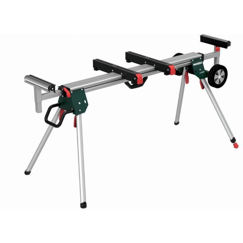 Metabo - Cavalletto-basamento troncatrice KSU 401 - Leggero e robusto supporto per troncatrice con funzione di carrello per l'uso mobile con la sega montata - Rapidamente pronto all'uso grazie ai piedi bloccabili e alla stabilità regolabile - Supporti pezzo pieghevoli con rotelle e fermo pieghevole per tagli seriali precisi - Adatto anche a tutte le troncatrici comuni grazie alla base universale della macchina (può essere montato senza attrezzi) - Con 1 coppia di basi per macchine (629008000) Dati tecnici: Lunghezza totale: 168 cm - 400 cm Altezza dei supporti del pezzo da lavorare: 92 - 99 cm Carico massimo nella zona centrale: 250 kg Peso: 25 kg