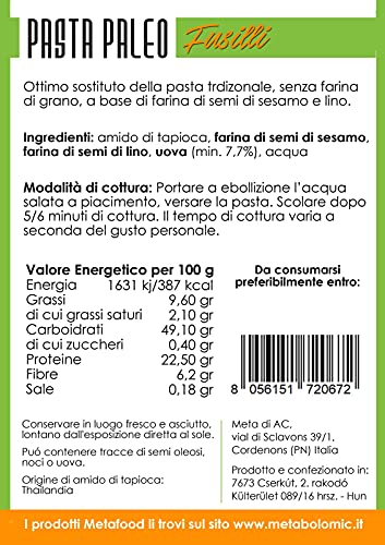 MetaFood - Pasta Paleo - Fusilli a base di Farina di Semi di Sesamo e di Lino. Ottimo sostituto della pasta tradizionale. Senza Glutine. Senza grano nè legumi. 250 g