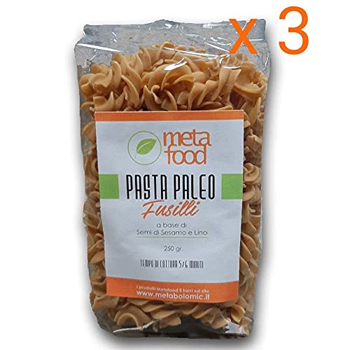 MetaFood - 3 x Pasta Paleo - Tre Pacchi di Fusilli a base di Farina di Semi di Sesamo e di Lino. Ottimo sostituto della pasta tradizionale. Senza Glutine. Senza grano nè legumi. 3 x 250 g