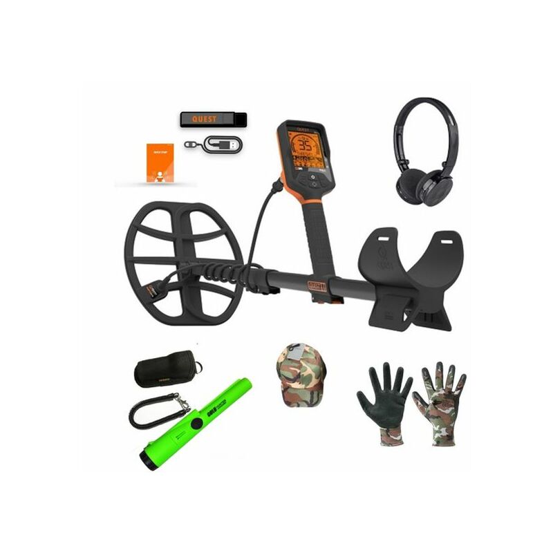 Quest metal detector Q35 3 frequenze di ricerca (Hunter pack) Descrizione Il Quest Q35 è dotato di 3 frequenze di ricerca intercambiabili ed è completamente impermeabile fino a una profondità di 5 metri sotto l'acqua. Viene fornito con un modulo radio integrato e cuffie Quest Wirefree Lite senza fili. È dotato di una piastra di ricerca DD Raptor11 da 28 x 26 cm per una maggiore profondità e reattività. Il Q35 è leggero, compatto, ergonomico e molto robusto. La batteria al litio Li-Po integrata da 3000 mAh può essere ricaricata magneticamente e l'illuminazione dell'indicatore arancione completa l'aspetto unico. Frequenze di ricerca intercambiabili Con il Quest Q35 hai anche la possibilità di cambiare la frequenza di ricerca. Ad esempio, se preferisci cercare oggetti più grandi sepolti, è consigliabile impostare il Q35 su 5 kHz. Se stai cercando solo piccoli gioielli o piccoli pepite d'oro, è meglio impostare il Q35 su 21 kHz. Se stai cercando solo monete, è meglio impostarlo su 13 kHz.
