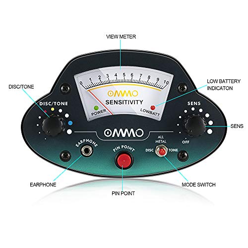 DISPLAY PUNTATORE E FUNZIONAMENTO FACILE - L'ultimo metal detector OMMO con schermo puntatore, molto facile da leggere con tutti i parametri come la modalità di rilevamento, il livello di sensibilità e le condizioni della batteria. Una volta che il fondo di destinazione, il puntatore oscillerà a destra. Ruotare l'interruttore in senso antiorario su OFF per spegnerlo. Ruotalo in senso orario allontanandolo da OFF per accenderlo. La sensibilità è regolabile da 0 a 10 con il pulsante SENS
