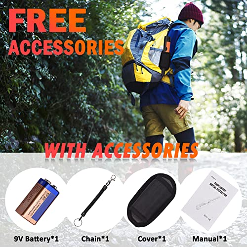 【Accessori Completi】 La confezione che hai ricevuto comprende: pinpointer metal detector + batteria 9V + custodia protettiva portatile + catena antismarrimento + manuale italiano. (Non mettere la parte metallica della catena anti-smarrimento vicino alla parte di rilevamento del rilevatore, altrimenti si verificherà un rilevamento accidentale)