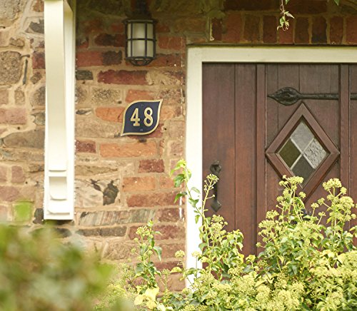 The Metal Foundry Targa con numeri civico a goccia, stile moderno, contemporaneo, in ottone pressofuso, con numero, colore, dimensioni e lettera.