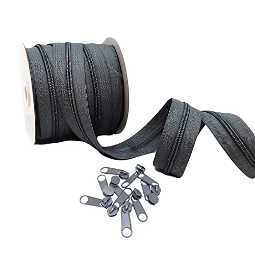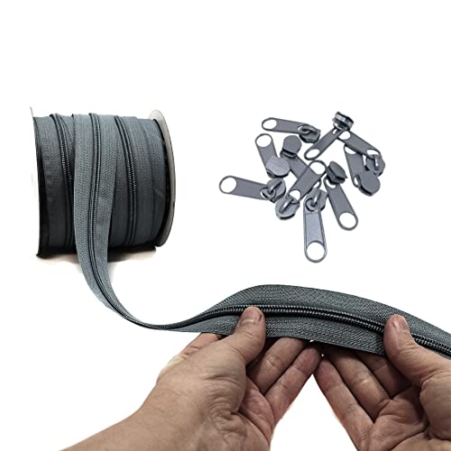 25 Metri di Chiusure Lampo in Nylon + 10 Cursori Liberi Tiretti in Metallo, Cerniera per Cucire, Chiusure Lampo al Metro per Cucire su Vestiti, Tessuti, Chiusuri Lampo al Metro n.3, (Grigio 311)