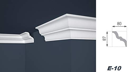 50 metri di modanatura per stucco E-10 (25 pezzi) - lunghezza per modanatura: 200 cm, dimensioni: 80 x 87 mm, diagonale: 118 mm tolleranza: +/- 2 mm, materiale: polistirolo estruso / XPS, colore: bianco, densità: circa 50 kg/m³