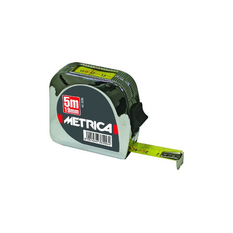 Metrica - Metro a nastro con custodia cromata 5 m x 19 mm - 8206 Finestra per la lettura diretta delle misure interne Nastro rivestito in nylon, resistente all'abrasione, resistente agli acidi, non riflettente Cassa cromata Con clip Dati tecnici: Lunghezza: 5 m Larghezza: 19 mm Graduazione: mm B: 74 mm