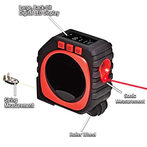 Multifunzione 3 in 1: 3 diverse modalità di misurazione: modalità rotolo, modalità cavo, modalità sonic, precisione fino a 1/100 di pollice. Sarete in grado di misurare qualsiasi tipo di superficie con precisione e facilità con la modalità sonora (Laser) per lunghe distanze, modalità stringa per oggetti rotondi, garantisce precisione con tre modi di misurazione.