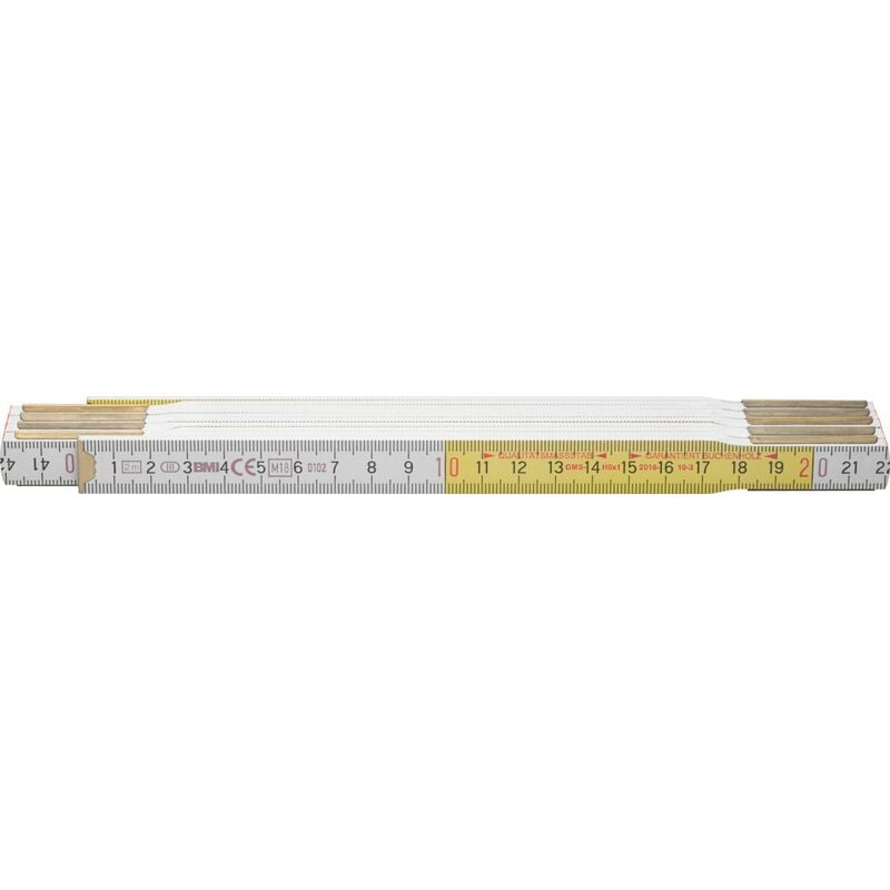 Scala millimetrata su lato inferiore e superiore. Graduazione di facile lettura. Decimali in rosso. Stecche in faggio di prima qualità. Verniciatura per immersione − in colore bianco e giallo, alternata ogni 10 cm, per una migliore lettura. Snodi ad anello altamente resistenti con molle in acciaio temprato e rivetto coperto. Dati tecnici Tipo di prodotto Metro pieghevole Materiale Legno di faggio Norma EG III Lunghezza, m 2 Larghezza, mm 16 Numero di stecche 10 Spessore, mm 3,3