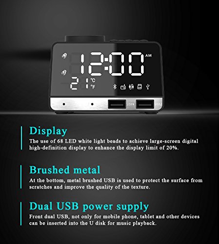 Doppia sveglia: doppia funzione sveglia (può impostare allarme temporaneo e sveglia a lungo termine), sveglia 1 allarme a lungo termine, sveglia 2 spegnimento automatico allo stesso giorno, funzione snooze a 5 minuti, sveglia disponibile / Musica TF card